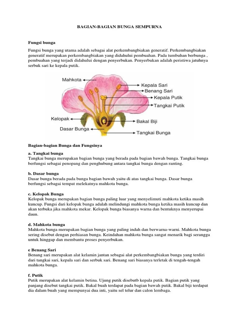 Berikut ini adalah bagian dari bunga yang sempurna dan fungsinya: